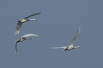 優美な姿のハクチョウさんですが、これがなかなか元気。時々羽ばたきを見せてくれたり、オス同士の示威行動なのか背伸びしながら鳴き合ったり、けんかしたり……。鳴き声は力強く、餌どきともなると、その活気はなかなかのもの。まあ、シベリアまで4,000㎞も移動するのですから元気なのは当然なのかも。